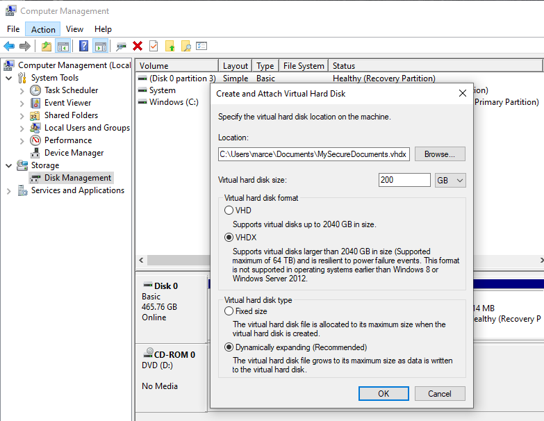For the Location, there is where you want the VHD file to initially live. Pick anywhere on your real hard disk, such as your “My Documents” folder, and name it anything, such as “MySecureDocuments.vhdx”.