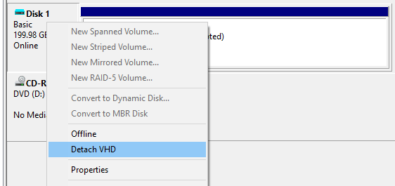 Return to the list of disks. In the left part of “Disk 1” where it says “Online”, right click and select “Detach VHD”.