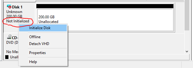 Now when you look at the list of disks, you’ll see a new one (the VHDX) that is not initialized.