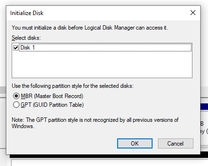 Next, we need to initialize the VHDX. On “Disk 1” where it says “Not Initialized” on the smaller left part (not the larger right part that says “Unallocated”, right-click on it and select “Initialize Disk” from that popup menu. It will bring up a new dialog.