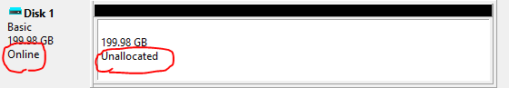 It should take only a few seconds to run if your VHDX is currently on your hard disk. If it is on a thumb drive, this will take significantly longer, several minutes. Now when you look at “Disk 1” in the list, it should say “Online” and “Unallocated”.