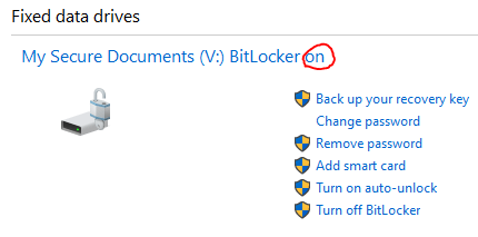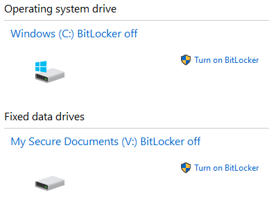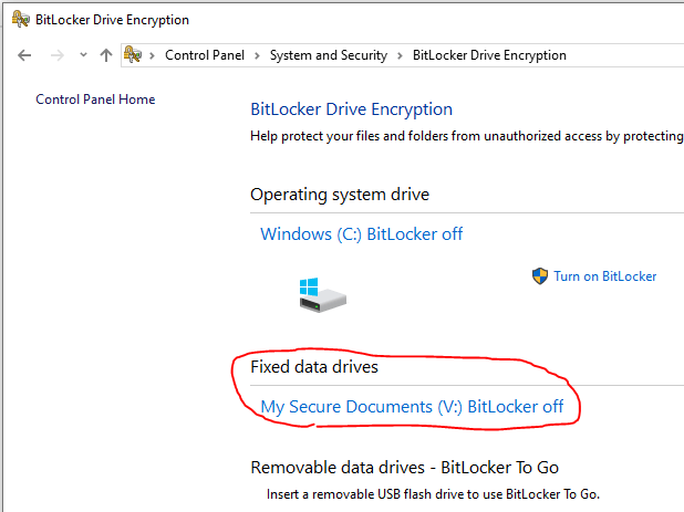 In the BitLocker control panel, there should be 3 sections: “Operating system drive”, “Fixed data drives”, and “Removable data drives”. We should see the V drive in the “Fixed data drives” section, and it should say “BitLocker off”.