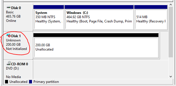 In this list, my VHDX is listed as “Disk 1”. Don’t confuse this with “Disk 0”, which is my real hard drive that holds the C drive and my operating system. So anytime you are clicking on a disk in this list, make sure it is “Disk 1” (or your equivalent, if you have additional hard drives). One way to match it up is to look at the disk sizes – in my list, it is just a hair under the 200GB I selected, whereas my real hard drive is 465GB. Throughout the rest of these instructions, I will refer to “Disk 1” as my VHDX.