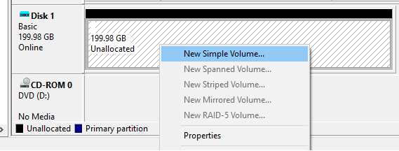 On “Disk 1” where it says “Unallocated” on the disk in the list, right click on it and select “New Simple Volume”. This will launch a multi-step wizard. Click Next to start the wizard.